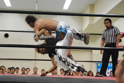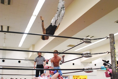 「スーパーカー!」ムーンサルト(右写真)。なつかしいフレーズだ。カウントは2。