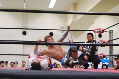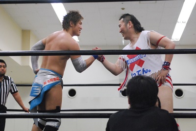 「楽しんご!」エルボードロップ(左写真)、ばってん2で返す。