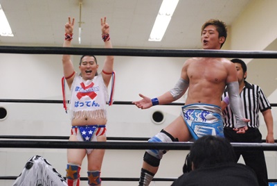 ばってんが観客と「ホー!」のコール&レスポンスをやってるとMIKAMIが背後からドロップキック(右写真)、