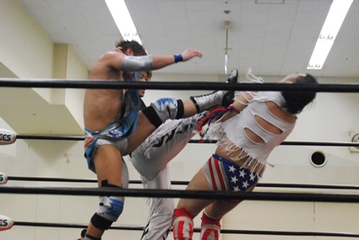MIKAMIと大石はばってんをロープに振ってダブルのビッグブーツ(左写真)。