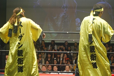 高尾を追放したシットハートファウンデーションとスーザン親衛隊の「業務提携」が発表。屋号が命名した新ユニット名は「スーザン・シットハート・スーパースターズ」(左写真)。略称「SSS」とか言ってまたナチっぽい衣装にするんだろうか?