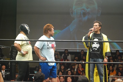 高木三四郎が東郷に「ディック東郷、東郷さん、ありがとうございました。東郷さんのいなくなったDDT、どうなるかまだ彼らにも見えてないかもしれない。でも必ずや両国大会を成功に導いて、これからも頑張って行きたいと思います。」(左写真)。