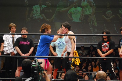 一人残されたKUDO(左写真)は「フザケんじゃねえ、俺はKing of DDTチャンピオンだ。必ずベルトを獲る!みんなついて来い!」