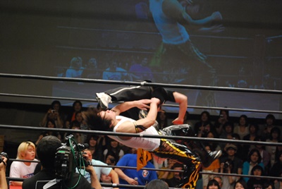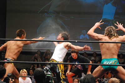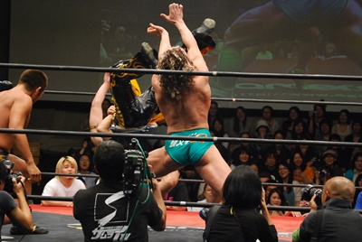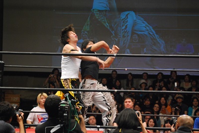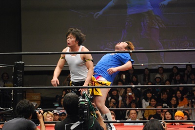 ケニー波動拳、飯伏がジャーマン(左写真)。