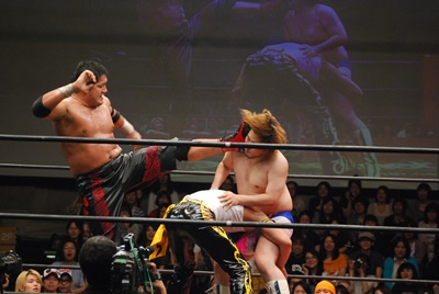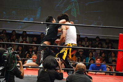 ドラマチック注入式開始。高梨トラースキック(左写真)、石井エルボー。