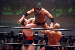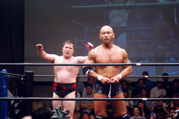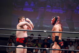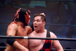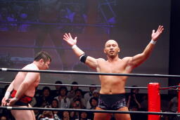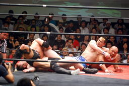 TAKAがジャストフェースロックで邪道を押さえる間にサスケ片エビ固め(左写真)、カウント3。