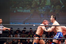 TAKAは起き上がるとサスケに抗議(左写真)、サスケ平謝り。