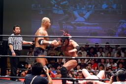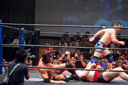TAKAトラースキック(左写真)。カバーは邪道がカット。TAKAが邪道を場外に出す。