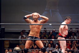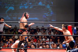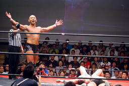 3人ダウンしたのを見て勝ち誇る邪道(右写真)、