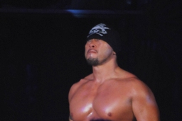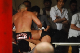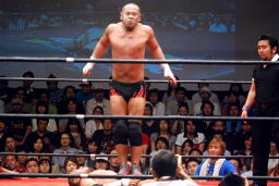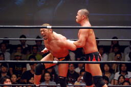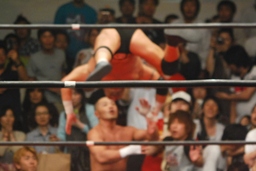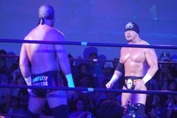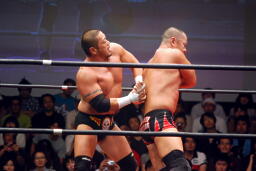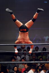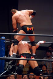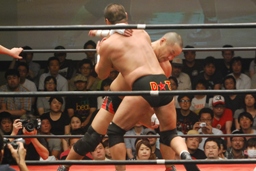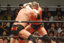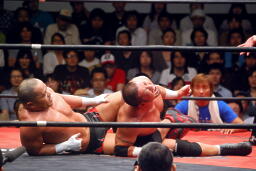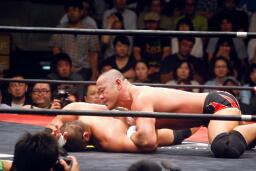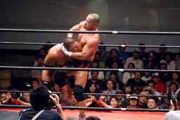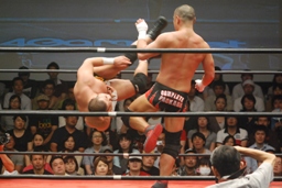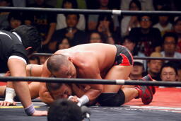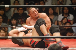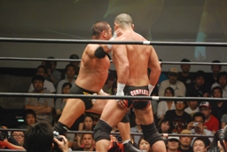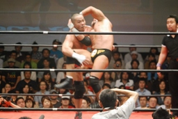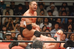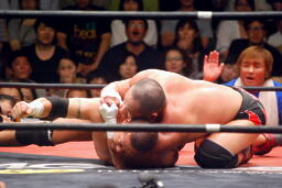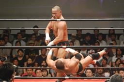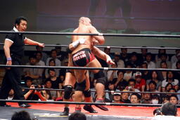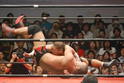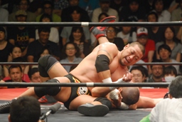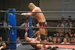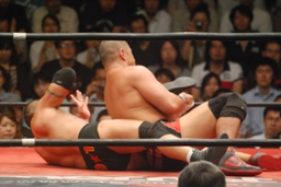 ロックアップ、東郷ヘッドロック、フライングメイヤーからグラウンドヘッドロック(右写真)。外道エビ固め、カウント2。