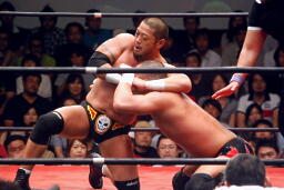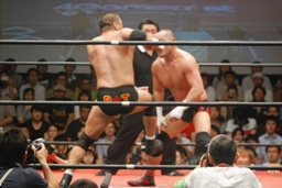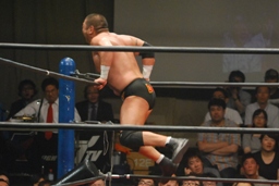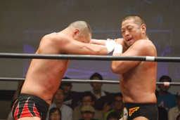 東郷ロープに振る、外道ショルダーブロック(左写真)。