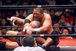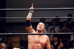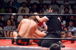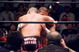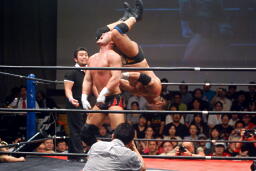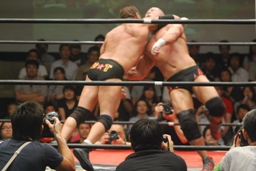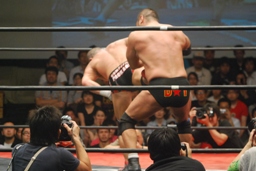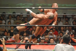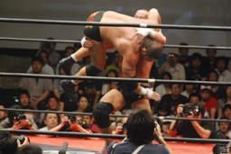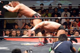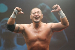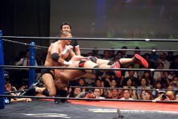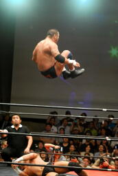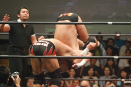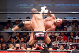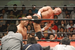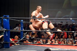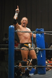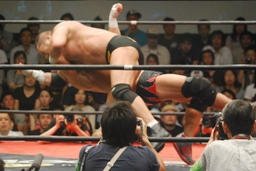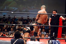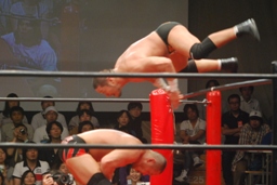 東郷セカンドロープに上がってポーズ(右写真)、そしてリングに向かってバック宙(撮れず)。