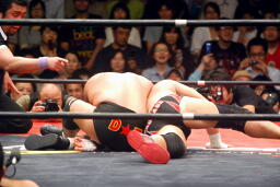 東郷パンチ、鉄柱攻撃、外道切り返し東郷激突。外道先にリングに戻る。東郷はカウント17で戻りエプロンからロープ越しに飛びついて(左写真)、