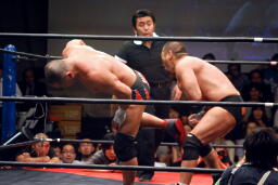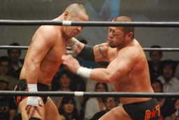 カウント8で両者立ち上がると東郷パンチ、外道張り手(左写真)の打ち合い。