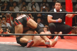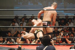 外道ニーリフト連打、串刺しでもう一発(右写真)。20分経過。