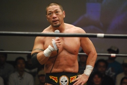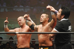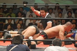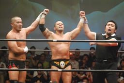 外道と松井レフェリーが東郷の手を上げる(左写真)。