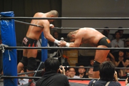 東郷「今日は平日にもかかわらず、たくさんのご来場ありがとうございました。外道さん!自分は外道さんが先輩でよかったです。僕がこの業界に入った時、4人の先輩がいました。外道さん、邪道さん、デルフィンさん、サスケさん。どれも大事な先輩です。自分はこの4人が先輩じゃなかったら、たぶんこの場にはいなかったでしょう。そのくらい大事な先輩です。外道さん、今日は念願のシングルマッチ、叶えてくれてありがとうございました。」(右写真)
