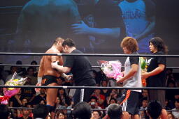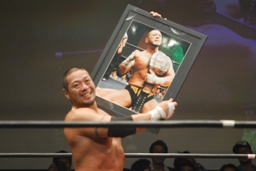 週刊プロレス・佐藤編集長からはKO-D無差別級戴冠時の写真をパネルにして贈呈(右写真)。