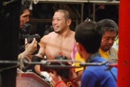東郷「自分は今日国内最後の試合ですが、ある意味今日がスタートです。今日をきっかけに世界を回って最後ボリビアで試合して、また皆さんの前に挨拶に帰って来たいと思ってます。1年後か、1年半後かわかりませんが、必ず無事に帰ってきます。皆さん本当に本当にありがとうございました!」(左写真)