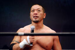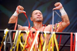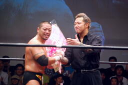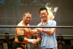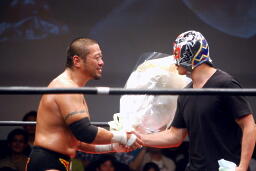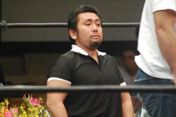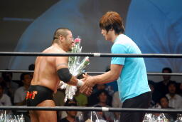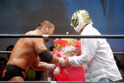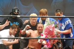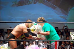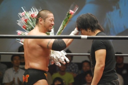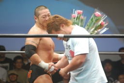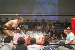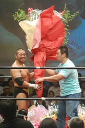 最後に大社長が超巨大な花束を持って登場(左写真)。試合はしてない。