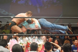 しかし花束を下ろして握手しようとすると東郷はガットショットからペディグリー!(右写真)出た!