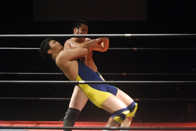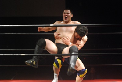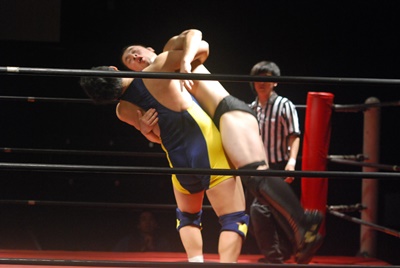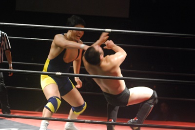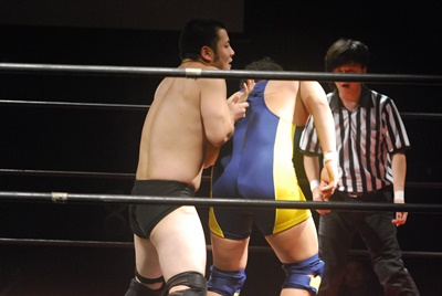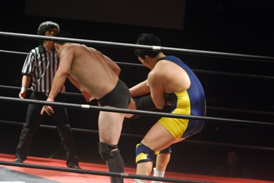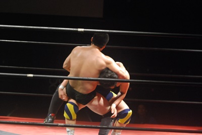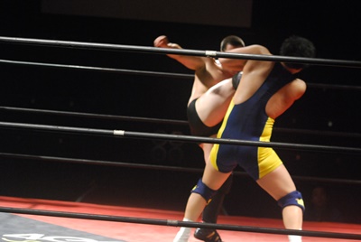 ロックアップ、福田がロープに押し込む、ブレーク。再度ロックアップ、関根腕をひねる、福田切り返す、関根さらに切り返して腕をひねる。福田切り返す、関根切り返してハンマーロック(右写真)。