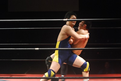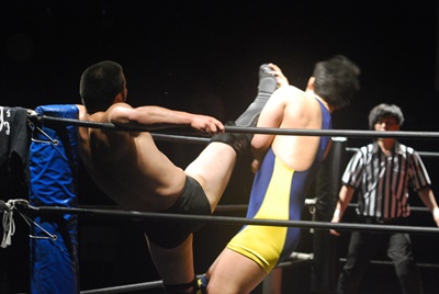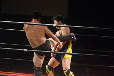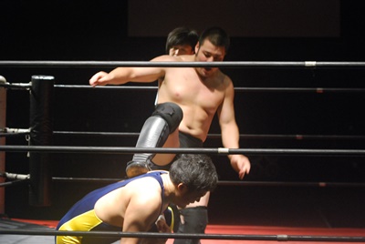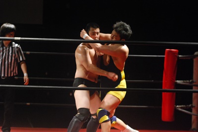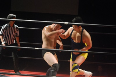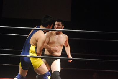 関根ヘッドロックに、福田切り返してヘッドロック、関根ロープに振る、福田ショルダーブロック(左写真)、ストンピング。