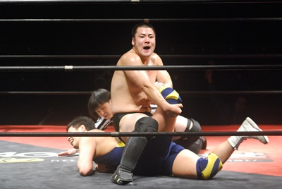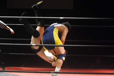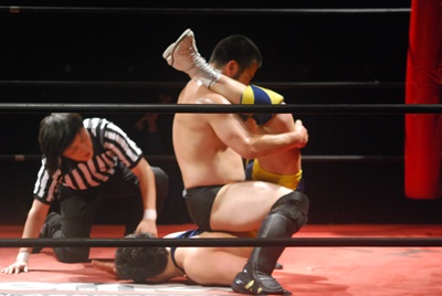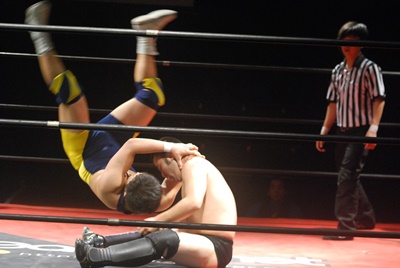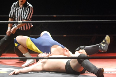 逆水平(左写真)からカバー、カウント2。この連続技は新しい。