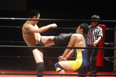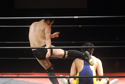 チンロック、リリースしてエルボードロップ、カウント1。サッカーボールキック(左写真)。