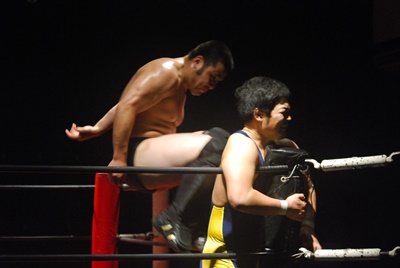 ボディスラムからストンピング(右写真)。首投げからスリーパー。