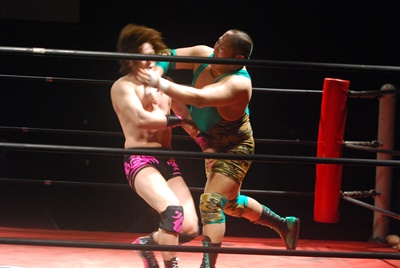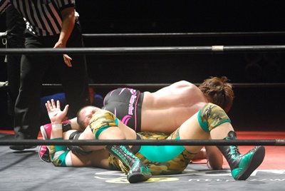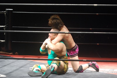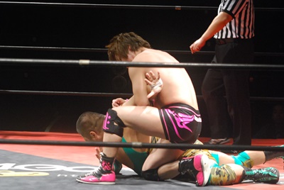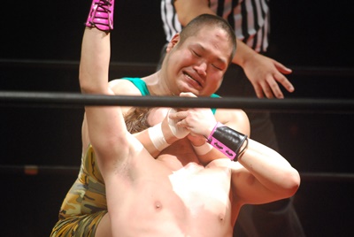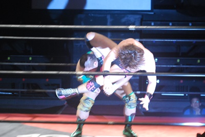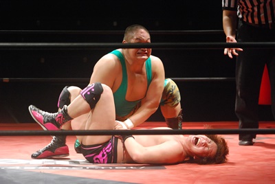 入江ボディシザーズ(右写真)、石井はレッグロックに切り返そうとするが失敗、ロープエスケープ。10分経過。