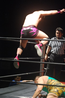石井コーナーに上ってミサイルキック(右写真)。