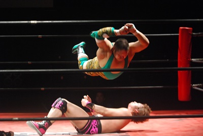 石井はエプロンに出る。入江突っ込む、石井キャッチしてDDT(左写真)、