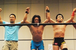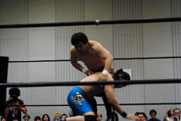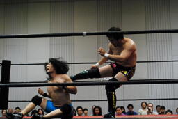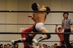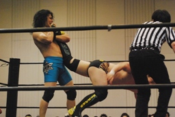 高尾ロープに振ってドロップキック(右写真)、カウント2。首投げからスリーパー、彰人ロープ。高尾は佐藤にタッチ。