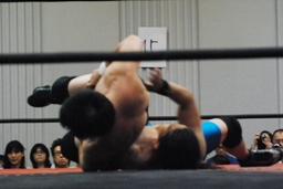 もう一発投げてカバー、カウント2。彰人アンクルホールドに(右写真)。