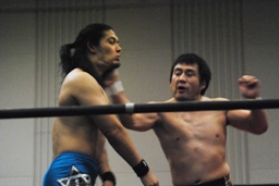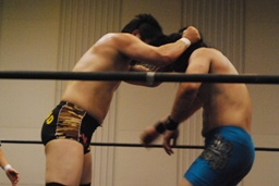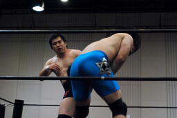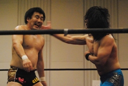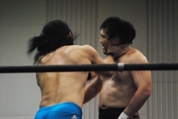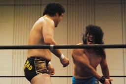 ケサ固めからヘッドロック、彰人切り返す(左写真)、佐藤ネックロック、彰人切り返す。佐藤フライングメイヤー、彰人ヘッドシザーズでブレーク。