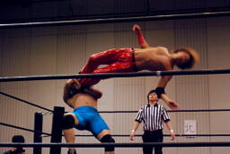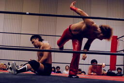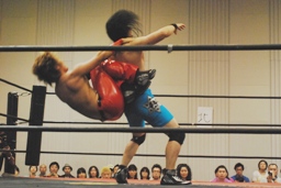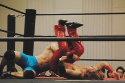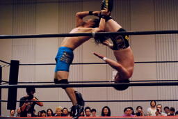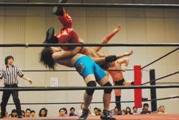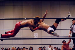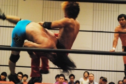彰人高尾にガットショット、ロープに振る、高尾はロープに飛び乗って反転フライングエルボー(右写真)、佐藤にタッチ。