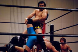 佐藤ストンピング、ミドルキック、彰人キャッチして抱え上げると投げっ放しの水車落とし(左写真)、平田にタッチ。佐藤も高尾にタッチ。