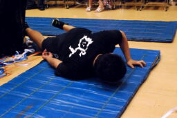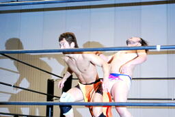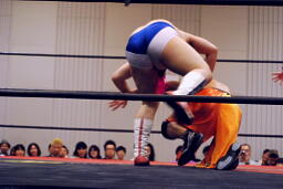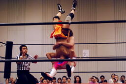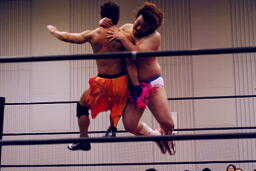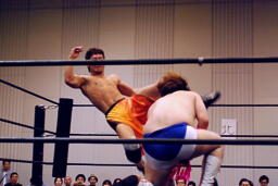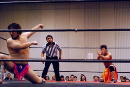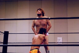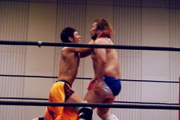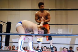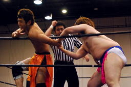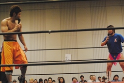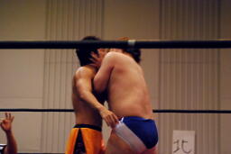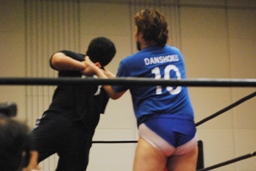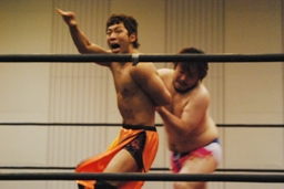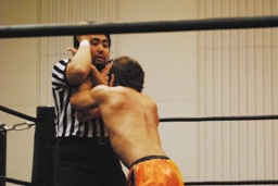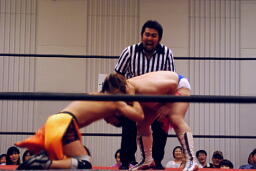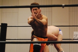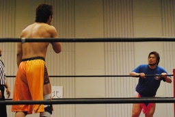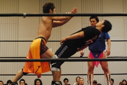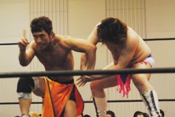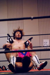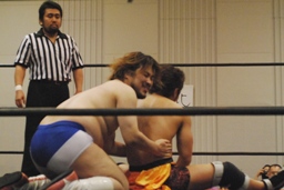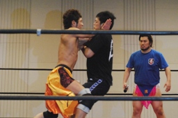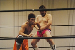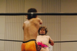 ということで試合開始。ロックアップ、ディーノいきなりボブキラー狙う(右写真)、高梨なんとか脱出してニーリフト、ディーノをロープに振る、