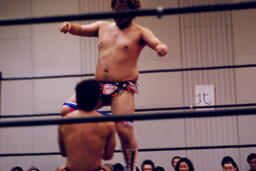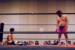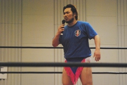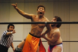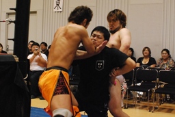 ディーノが福田の腕を取る、そこにまた高梨のクロスチョップ(右写真)、福田また失神。5分経過。