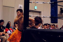 高梨は狩り真っ最中のディーノにリング上から「ディーノ!お前本当にボブ・サップに勝つつもりか?」(右写真)ディーノ狩りをやめない。