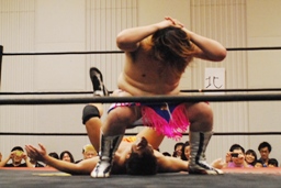 高梨は男色ドライバーをブロックしてついにディーノにクロスチョップ(右写真)。