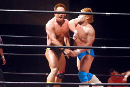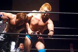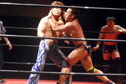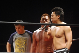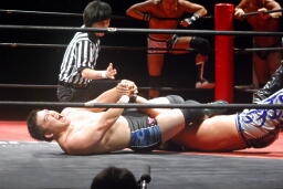 佐藤腕をひねる、松永切り返してハンマーロック、佐藤切り返す、松永カニばさみで倒しブレーク。ロックアップ、松永ロープに押し込むがクリーンブレーク(左写真)。握手してHARASHIMAとマイケルにタッチ。