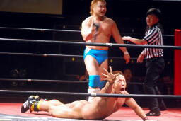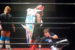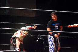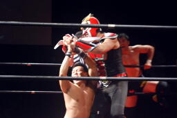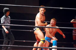 HERO!が平田の指を攻める(右写真)。この反則を松永がたしなめリングイン。落ち込むHERO!、なぐさめるHARASHIMA。平田は松長をロープに振ってドロップキック、佐藤にタッチ。5分経過。