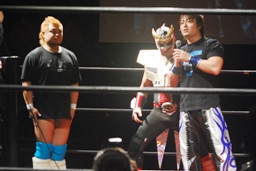 佐藤光留、中澤マイケル、平田一喜がリングに(左写真)。