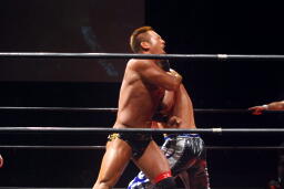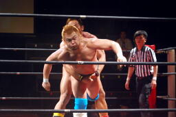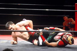 ニーパッドを脱ごうとするとHARASHIMAはガットショットからヘッドロック、マイケルロープに振る、ショルダーブロックの打ち合い(左写真)。