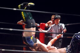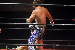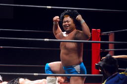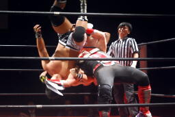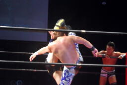 平田をコーナーに振って後頭部へのヒザ蹴りから「飛んでけー!」(右写真)カバー、カウント2。
