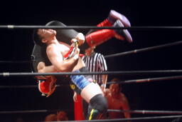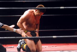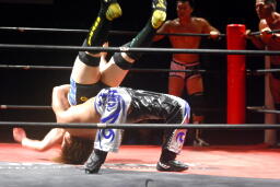 マイケルのTバックを脱がして全裸にした松永(右写真)、止めに入った木曽レフェリーを暴行、反則負けに。