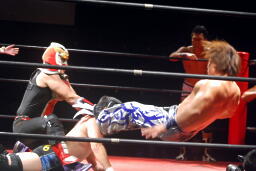 佐藤首投げからサッカーボールキック、ヒザ蹴り、マイケルにタッチ。松永マイケルにチョップ(左写真)、マイケルチョップ打ち返しストンピング、平田にタッチ。