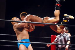ハイキックは相打ちに(右写真)。松永とマイケルにタッチ。10分経過。